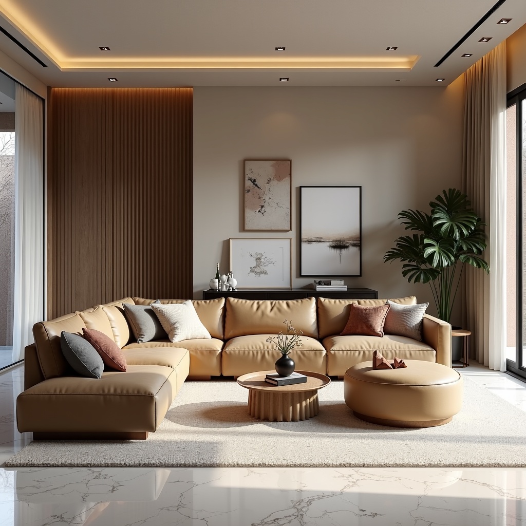 A high-resolution interior design photograph captures a luxurious sunken living room with a dreamy conversation pit. Dominating the room is an opulent leather couch that exudes a regal presence, complemented by a sleek marble floor. The space boasts a soaring ceiling, bathed in soft natural light, accentuating the elegant color palette of beige, black, white, and subtle pastel hues. This inviting setting, straight from an interior design magazine, evokes a cozy and sophisticated atmosphere with creative touches like minimalist art pieces and plush textured throw pillows.