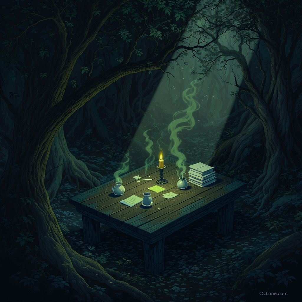 Intricate forest atmosphere with atmospheric olive lighting on the table, featuring a 4k UHD dark and moody vibe. The scene exudes hyper detail with vibrant colors against a rich forest background, presenting an epic composition. Octane render provides sharp focus and high-resolution isometric view, capturing a semi-realistic blend of CGI, sketch, cartoon, and drawing elements. The central shot remains vivid, while subtle creative touches enhance the mysterious ambiance, steering clear of low quality and poorly drawn aspects.