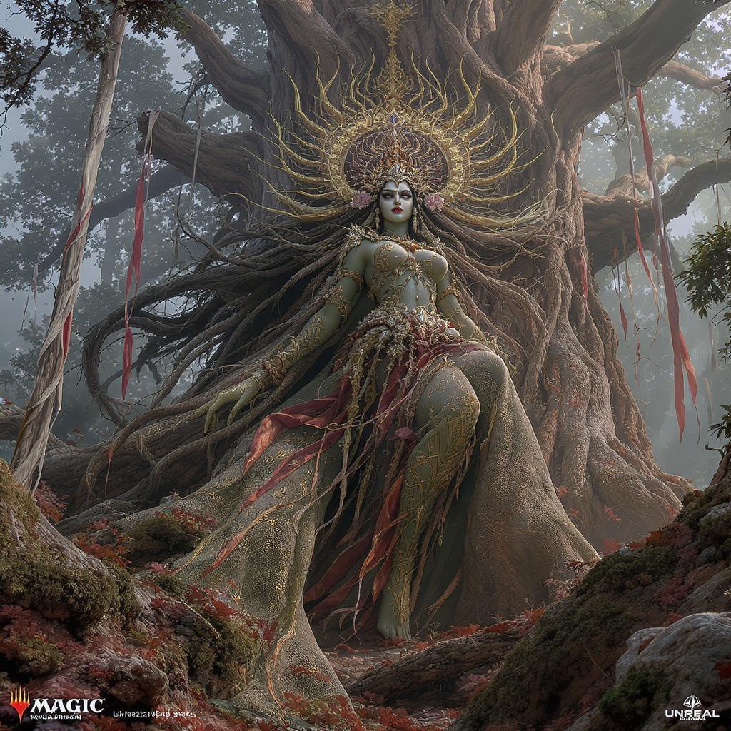 View this AI-generated image featuring a highly intricate hyper maximalist depiction of a cinematic forest deity with elaborate floral adornments and cascading long hair echoing the essence of magic the gathering set against the majestic backdrop of a colossal ancient tree the deity assumes a captiv