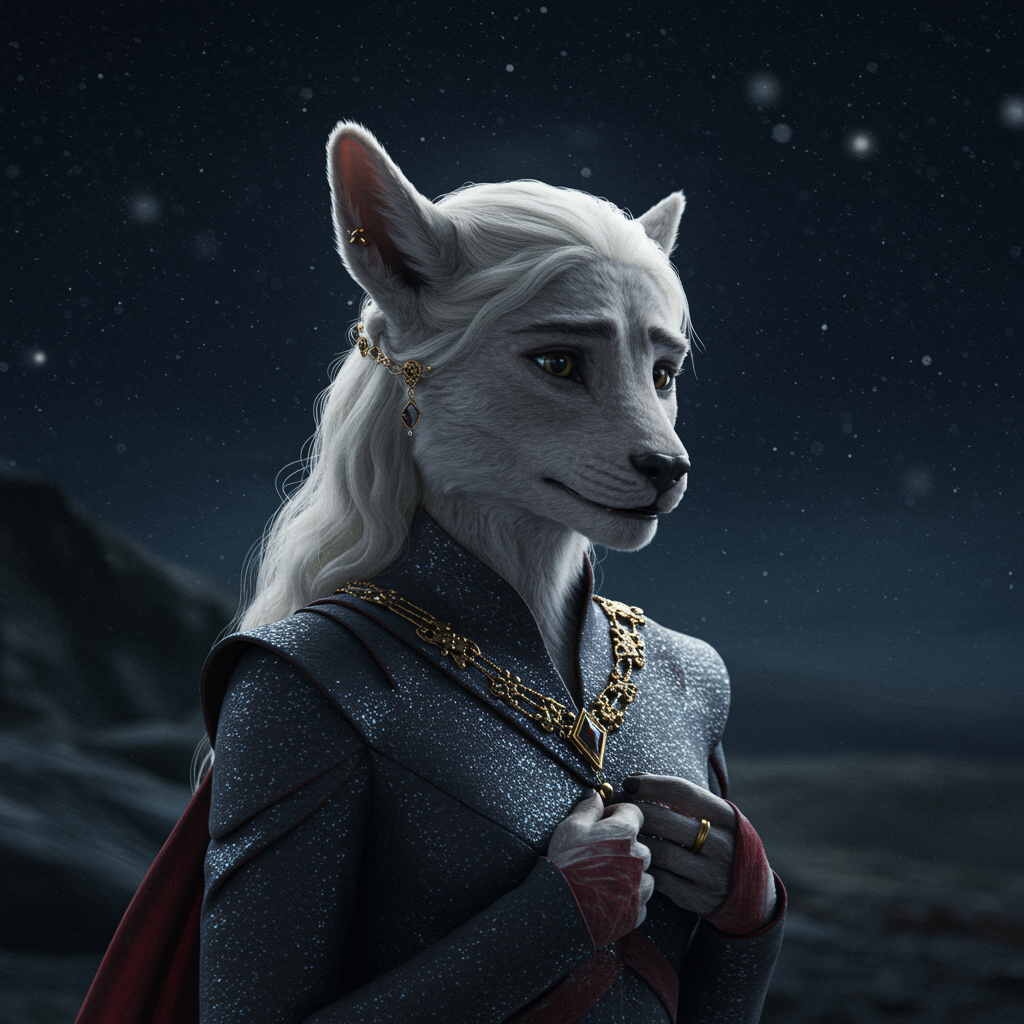 View this AI-generated image featuring intricately detailed anthropomorphic targaryen character adorned in shimmering attire captured in hyper realistic fashion under a starry night sky the scene evokes intense emotion with a majestic and cinematic lighting style that highlights every nuance of thei