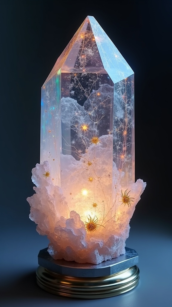 A shimmering, iridescent crystal from the distant future, its facets reflecting an array of ethereal colors. Within its translucent structure, intricate patterns of light pulse rhythmically, hinting at advanced technology embedded in its very core. Delicate veins of silver and gold trace across its surface, casting an otherworldly glow as though charged with energy. The crystal rests on a sleek metallic pedestal, surrounded by a halo of soft luminescence, in a setting that blends the natural world with advanced, cutting-edge design.