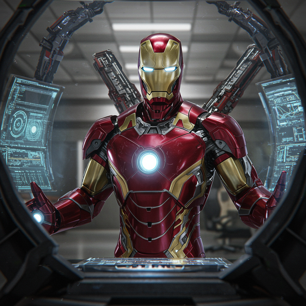 Iron Man in a hyper-realistic setting, embodying a vision of the future, showcasing advanced mechanics. The scene captures Iron Man in full growth, within his state-of-the-art studio, gazing directly at the viewer. This portrait, reminiscent of a film frame, exudes cinematic quality with nuanced lighting that highlights his armor's intricate details. The image, rendered in breathtaking realism, employs 3D techniques akin to those found in high-budget movies, created using cutting-edge technology. The composition effortlessly merges concept art aesthetics with the immersive capabilities of modern rendering engines, resulting in a striking and futuristic portrayal that captivates the imagination.
