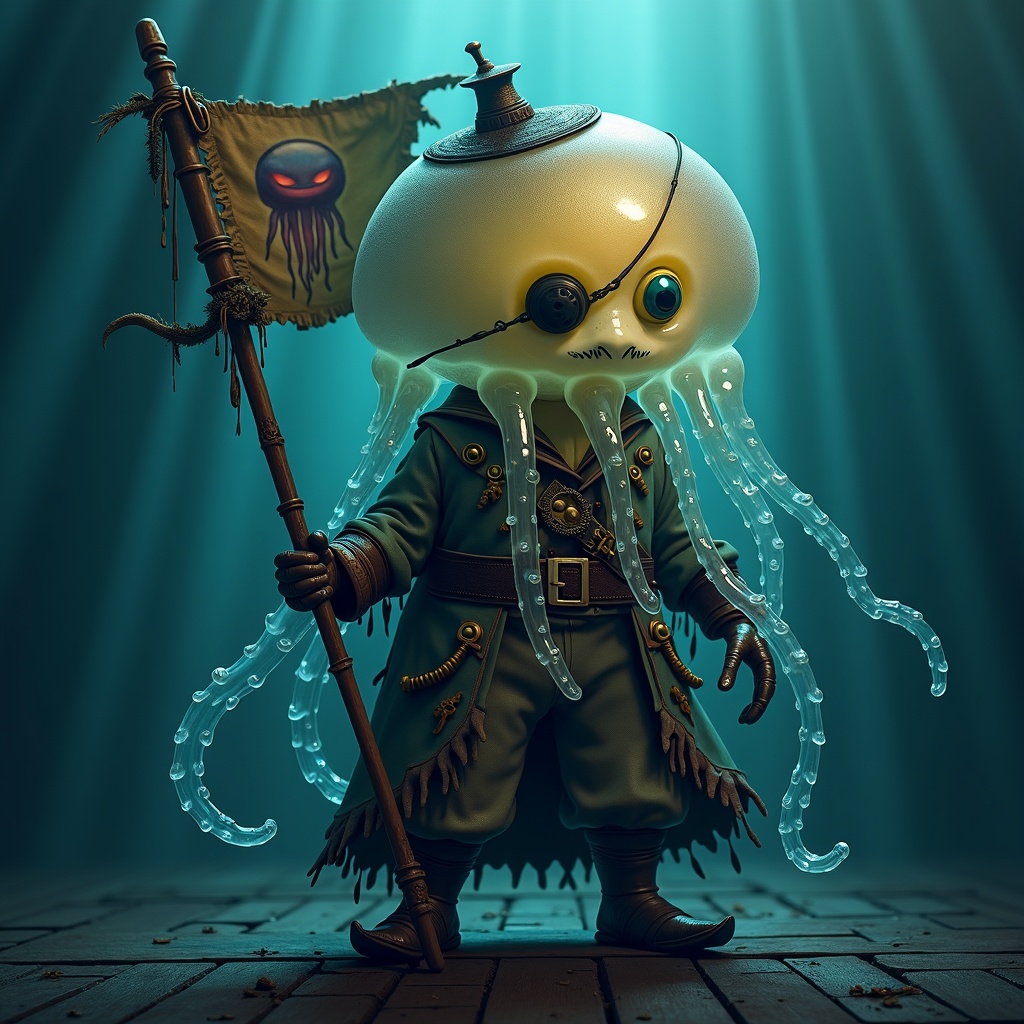 View this AI-generated image featuring an anthropomorphic jellyfish pirate stands poised with a commanding presence its translucent gelatinous tendrils forming an ethereal cape that shimmers subtly in the ambient light the pirate s eye patch shaped like a tiny seashell highlights its enigmatic gaze