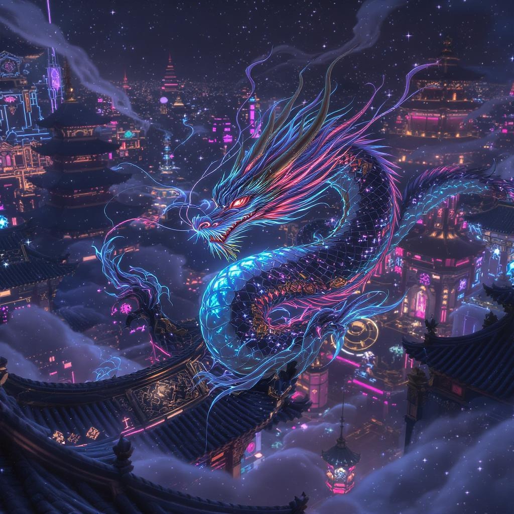 View this AI-generated image featuring kyoto animation inspired anime blended with traditional chinese artistry depicting a dragon soaring through a modern cyberpunk fantasy world the scene is bathed in cinematic lighting with an ethereal glow highlighting intricate and complex details the colors ar