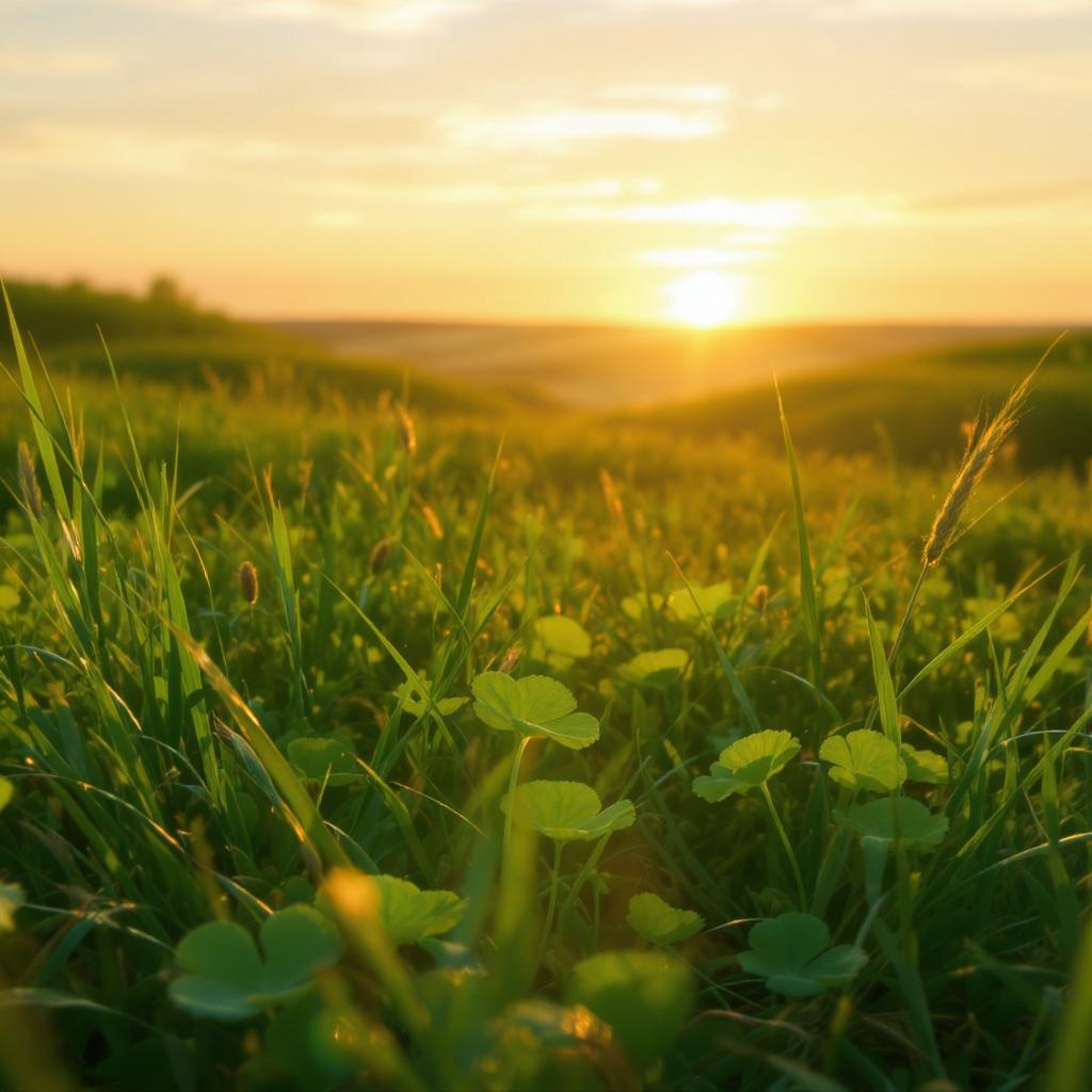 A serene landscape of lush green meadows, bathed in the golden glow of a setting sun, where a gentle breeze rustles through the tall grasses. In the foreground, a single clover stands out amidst the foliage, its vibrant green leaves catching the light. The scene reflects harmony and tranquility, inviting the viewer to pause and take in the beauty of nature's simplicity under a vast, open sky.
