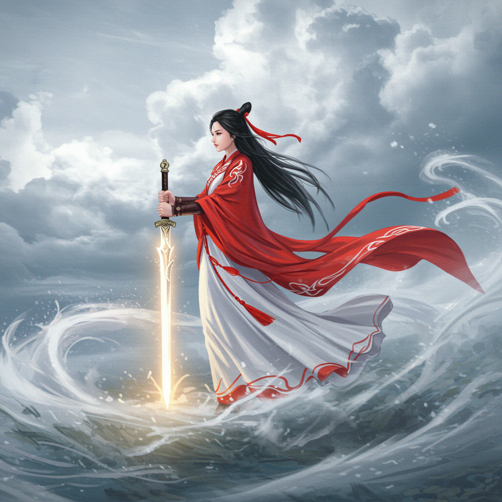 View this AI-generated image featuring in an ethereal landscape a girl stands poised in the background her sword gleaming with celestial light the scene reminiscent of xiaofei yue s style is alive with swirling hues of white and red capturing her colorful intricate costume that dances in the wind th