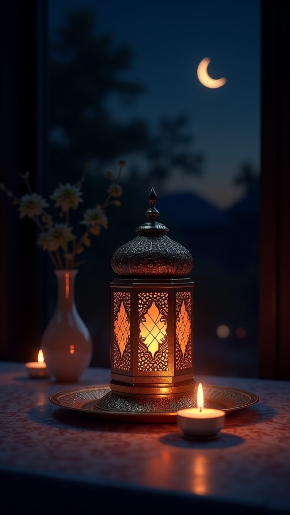 A mesmerizing lantern resting elegantly on a table, casting soft shadows, surrounded by an ambiance of mystique with a crescent moon illuminating the night sky; a digital masterpiece inspired by Ash Thorp and Khyzyl Saleem, this intricate 3D illustration captures the essence of exquisite Arabian art and delicate paper modeling techniques. The scene is set aglow with a candle's gentle flicker, blending intricate detail with stunning digital artistry, evoking the rich, ornate designs reminiscent of CGSociety excellence, celebrating the harmony of tradition and modernity.