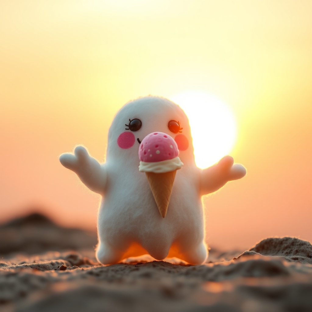 As the first light of dawn spills gently over the horizon, the world is painted in hues of soft pink and golden orange. Amidst this serene sunrise, a small, simple, and cuddly felt ghost with a charmingly plump form holds a vibrant scoop of ice cream in its tiny, outstretched hands. Its wide, joyful smile and twinkling eyes seem to hold the promise of innocent delight, piercing through any lingering shadows of the night. The plush texture of its felt body exudes warmth and tenderness, as if inviting even the hardest heart into a gentle embrace. As the sun's rays cascade over the scene, illuminating the little ghost's content expression, a sense of pure, unbounded love blossoms in the air, creating a tableau of sweetness that speaks to the universal language of happiness.