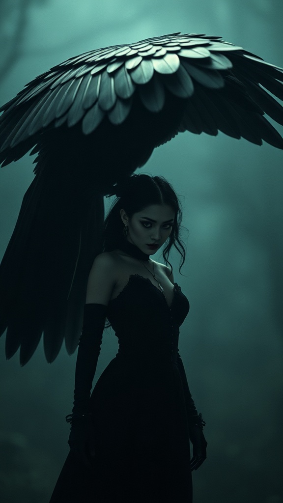 Lipstick-encrusted vampire emerges from shadows, a surreal embodiment of edgy surrealism; think Veronika Pinke meeting Ina Wong in a gothcore dreamscape. The scene dances with dark, moody colors, capturing a Ren Hang-inspired vibe with a bold contrast of scales. Underneath an enormous raven's wing, the vampiric figure stands, her silhouette sharp and enigmatic. Her eyes glint with mischievous allure, whispering secrets of the night. The world around her is raw and unapologetic, drenched in an otherworldly haze, where every detail is both vividly defined yet hauntingly elusive.