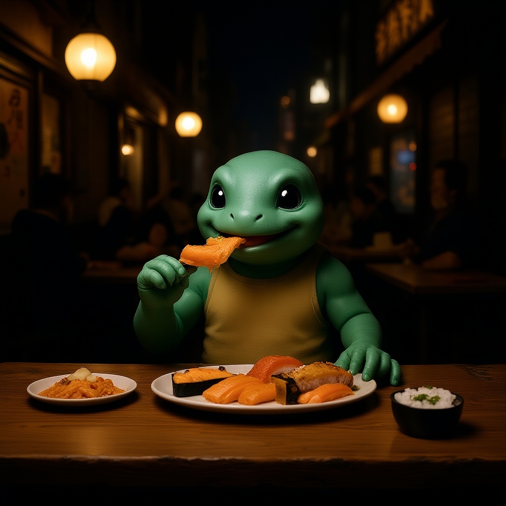 In a dimly lit Tokyo alleyway, beneath the glow of lanterns, Squirtle sits contentedly at a rustic street vendor's table, savoring a platter of freshly made sushi amidst the soft murmur of city life.