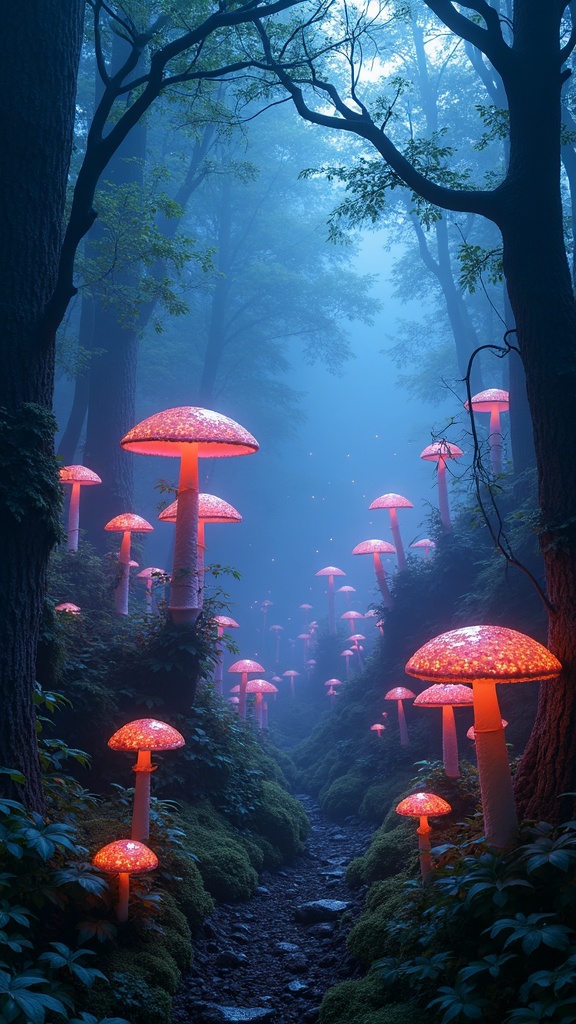 Lush expanse of towering, luminescent mushrooms dominates the forest landscape, their vibrant colors casting an otherworldly glow across the misty underbrush. The air is thick with the earthy scent of damp moss and rich soil, mingling with the faint hum of nocturnal creatures that flit between the glowing stalks. Delicate spores drift lazily in the soft, ambient light, creating a mesmerizing dance through the towering canopy, where otherworldly shadows play against the ancient, gnarled trees. Deep blues and purples intermingle with hints of ethereal green, painting a scene that feels both alien and strangely familiar. The tranquility of the forest is punctuated by the occasional rustle of leaves, adding a layer of mystery to this enchanted realm.