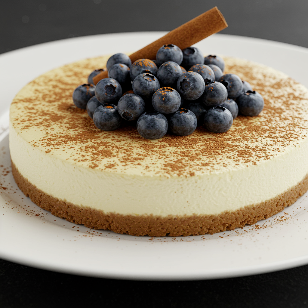 Luxurious culinary scene capturing an exquisite cheesecake adorned with a generous topping of fresh blueberries and a hint of cinnamon dust, set in an opulent Michelin-star kitchen. The photograph emphasizes intricate details with a rich depth of field, employing uplighting to highlight the natural textures and colors. The composition exudes elegance, focusing on the luscious creaminess of the cheesecake and the vibrant juiciness of the blueberries, creating a visual feast that blends artistry with gourmet sophistication.