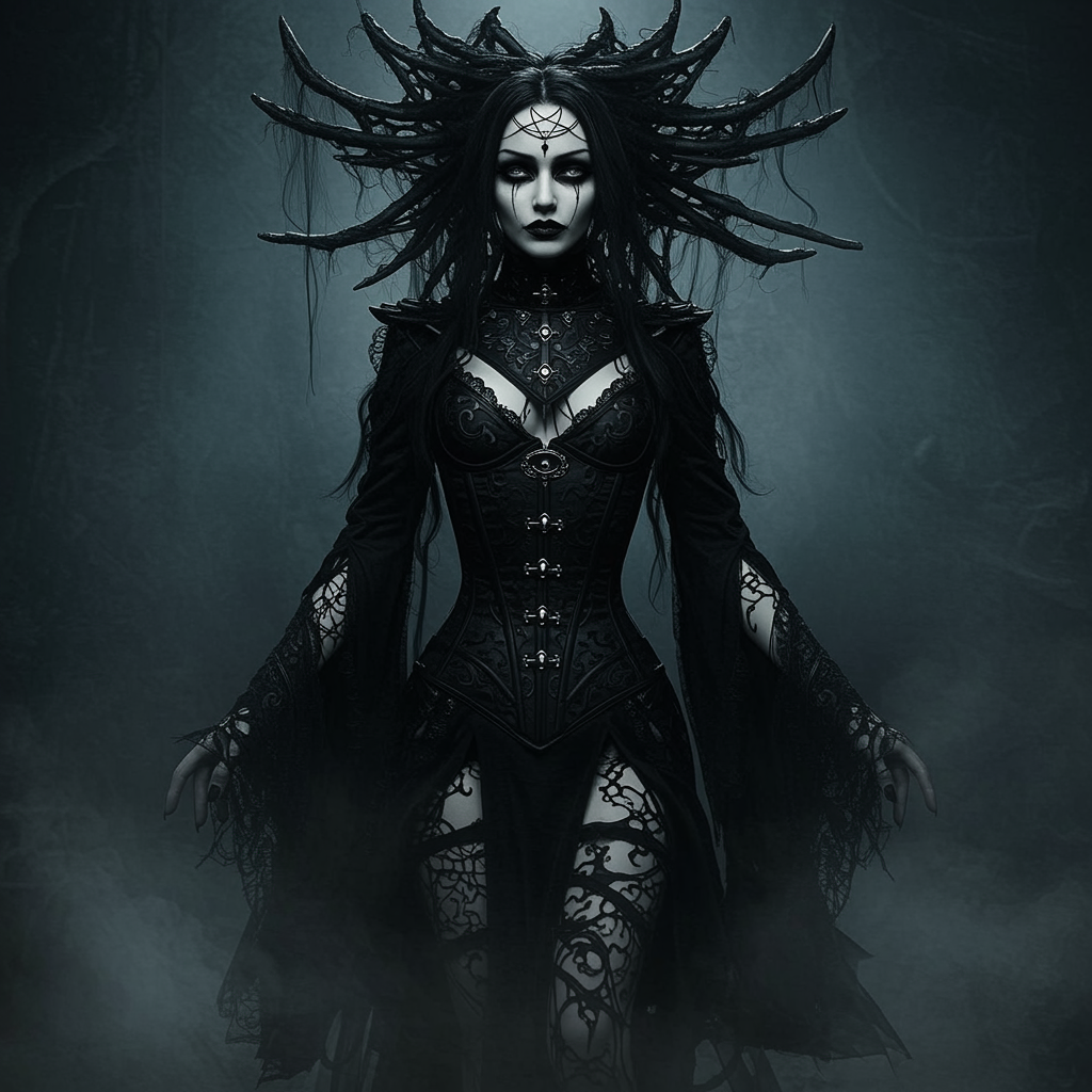 View this AI-generated image featuring a goth macabre grotesque woman adorned in occult attire exuding an air of horror and mystery with dark intricate designs and elaborate details captured with dramatic lighting that enhances her eerie presence photorealistic and cinematic quality with subtle nois