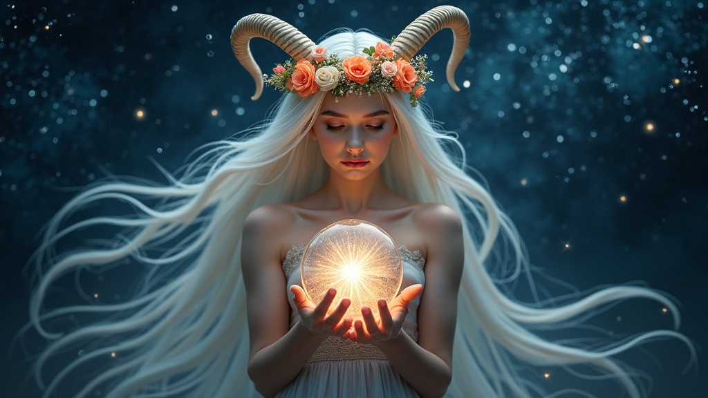 View this AI-generated image featuring a celestial maiden with ethereal horns and flowing long white hair stands gracefully beneath a vast expanse of shimmering stars in her delicate hands rests a glass orb containing a radiant singularity surrounded by a wreath of vibrant luminescent flowers the sc