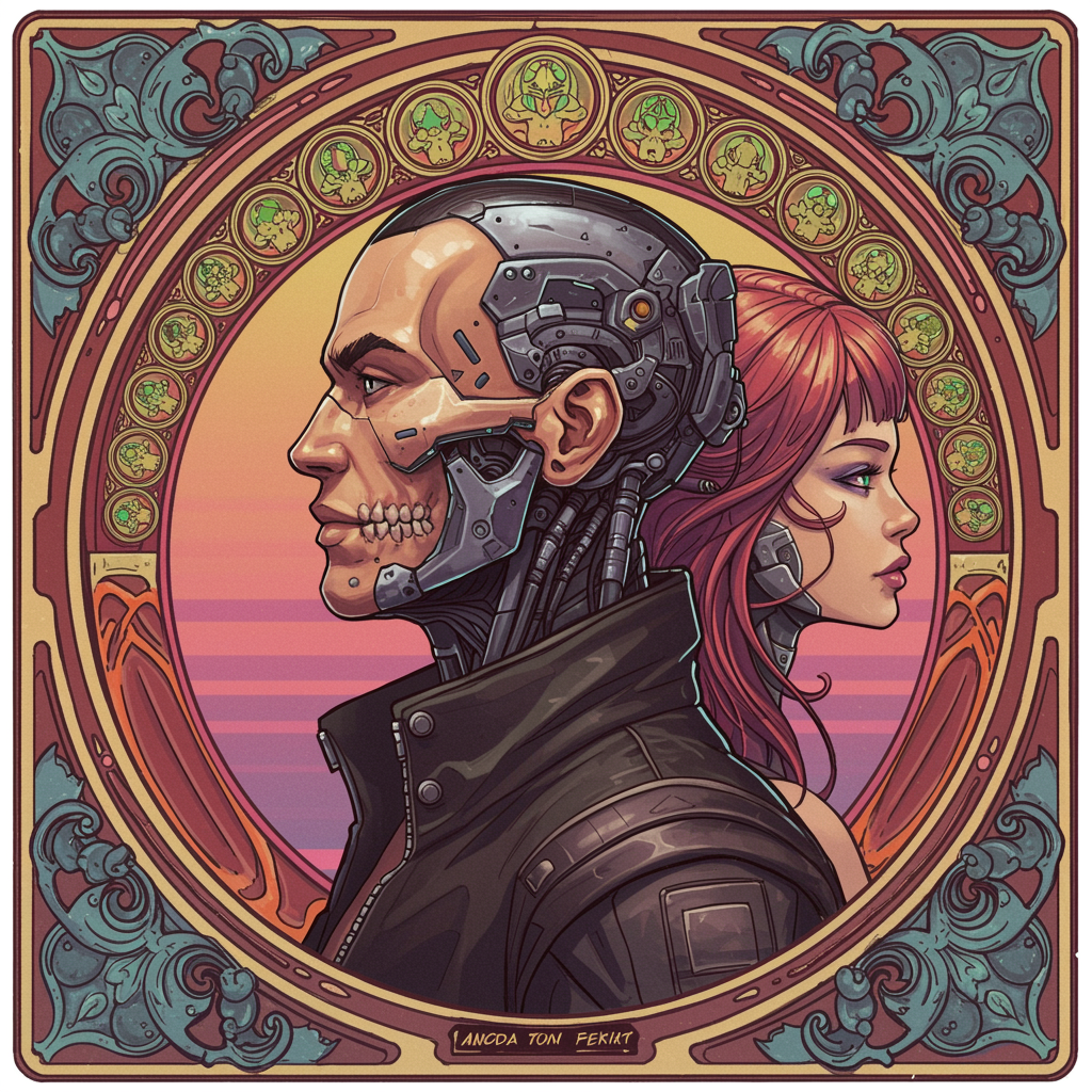 Male figure, side profile of a cyberpunk body with a cyborg skull, styled in Art Nouveau with an intricately detailed frame around the edge, featuring vibrant colors and embellishments. The artwork is high definition concept art, blending digital and synthwave aesthetics, incorporating a female figure with equally intricate and vibrant detailing, creating a harmonious balance between the futuristic and the decorative.