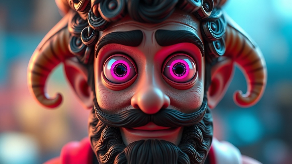 A close-up of a whimsical man with horns and a curly beard, a character portrait inspired by a senior character artist and polycount contest winner. Rendered in Unreal Engine 5, the scene captures the man's bright, clear neon eyes reminiscent of a Pixar character. His eyes are cartoonishly large and circular, with a reflective sheen. The rendering style is cinematic and smooth, yet abstract, showcasing intricate details in a slightly disfigured, deformed cartoon form. The character appears animated, like a toy figure, with exaggerated features and a playful expression. The background is a blur of vibrant, weird colors. His anatomy is intentionally skewed, adding a quirky charm, as if the figure is from an alternate, playful universe. Elements of the scene include extra limbs, a frame around the character, and a mix of 3D textures and effects, providing a surreal, playful twist on traditional character design.