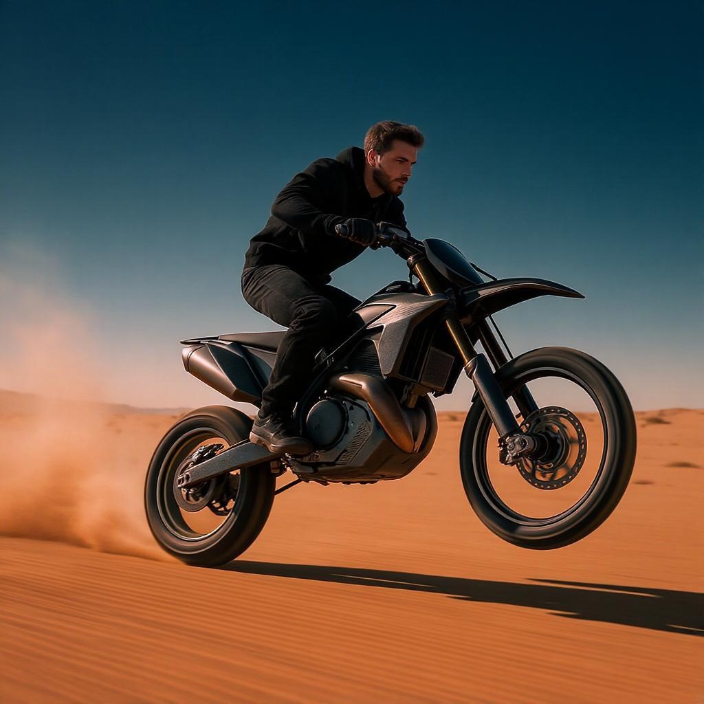A young man clad in sleek black attire rides a cutting-edge carbon fiber electric dirt bike across a vast desert expanse. The bike's futuristic design gleams under the atmospheric lighting, showcasing its advanced battery-powered engine. Captured in a dramatic wide-angle shot, the composition emphasizes the dynamic thrill of high-speed motion, with the rider executing a perfect wheelie. The scene is illustrated with artful motion blur, revealing the kinetic energy of the moment. The image, presented in 8k ultra-high-definition, features a professionally color-graded palette with a deep, moody ambiance. A polarizing filter enhances the crispness of a dark blue, cloudless sky above, eschewing any vignette to maintain clarity. The photograph, taken in the style of contemporary modernist photography, bursts with adrenaline and innovation, a vivid portrayal of high-tech adventure in stark contrast to traditional combustion engines.