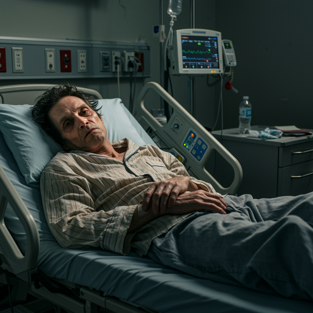 A weary man with a gaunt expression rests on a hospital bed, his fatigued eyes meeting yours as the sterile backdrop of medical equipment silently hums around him.