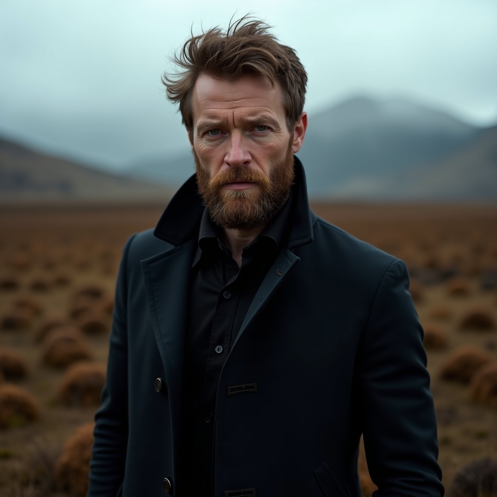 A rugged man in a field, poised for the camera, exuding a mysterious allure reminiscent of Daria Endresen’s artistry, combined with Kris Knight’s enigmatic style. He stands against the backdrop of a moody Scottish landscape, the scenery enveloped in a tapestry of light navy and dark brown hues. His attire is subtly sophisticated, echoing the minimalistic elegance of Georg Jensen designs. The photograph captures intense close-ups, drawing the viewer into the depths of his expressive eyes and weathered skin, encapsulated in a matte finish that softens the overall image, blending seamlessly with the natural surroundings.