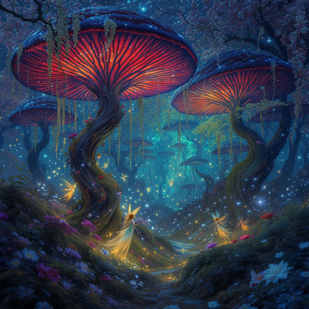 View this AI-generated image featuring a fantastical masterpiece depicting an enchanted woodland where ethereal fairies flit beneath a canopy of mushroom like trees bathed in a dreamlike luminescence the scene glows with a vibrant spectrum of colors the dim mystical light creates a surreal atmospher