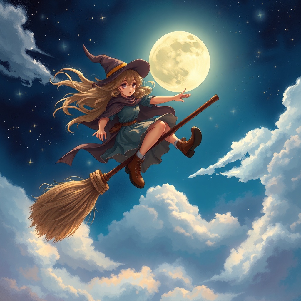 Masterpiece, exquisite detail, vibrant illustration, one girl, solo adventurer, fantasy realm, flying high, broomstick journey, night sky canvas, outdoor enchantment, magical aura, casting spells, luminous moon, sparkling stars, ethereal clouds, wind-swept hair, flowing cape, iconic hat, sturdy boots, enchanted broomstick, radiant glow, mysterious allure, captivating charm, spirited whimsy, bold exploration, exhilarating freedom, awe and imagination, fierce determination, skillful grace, rapid speed, dynamic movement, kinetic energy, realistic portrayal, naturalistic elements, figurative essence, representational art, captivating beauty, fantasy lore, mythical tapestry, fairy tale essence, folklore magic, legendary narratives, witchy presence, wizardly aura, mythical beings, fantastical realms, crafted composition, grand scale, defined foreground, layered middle ground, expansive background, immersive perspective, shifting light, vibrant color, intricate texture, breathtaking detail, astonishing wonder.