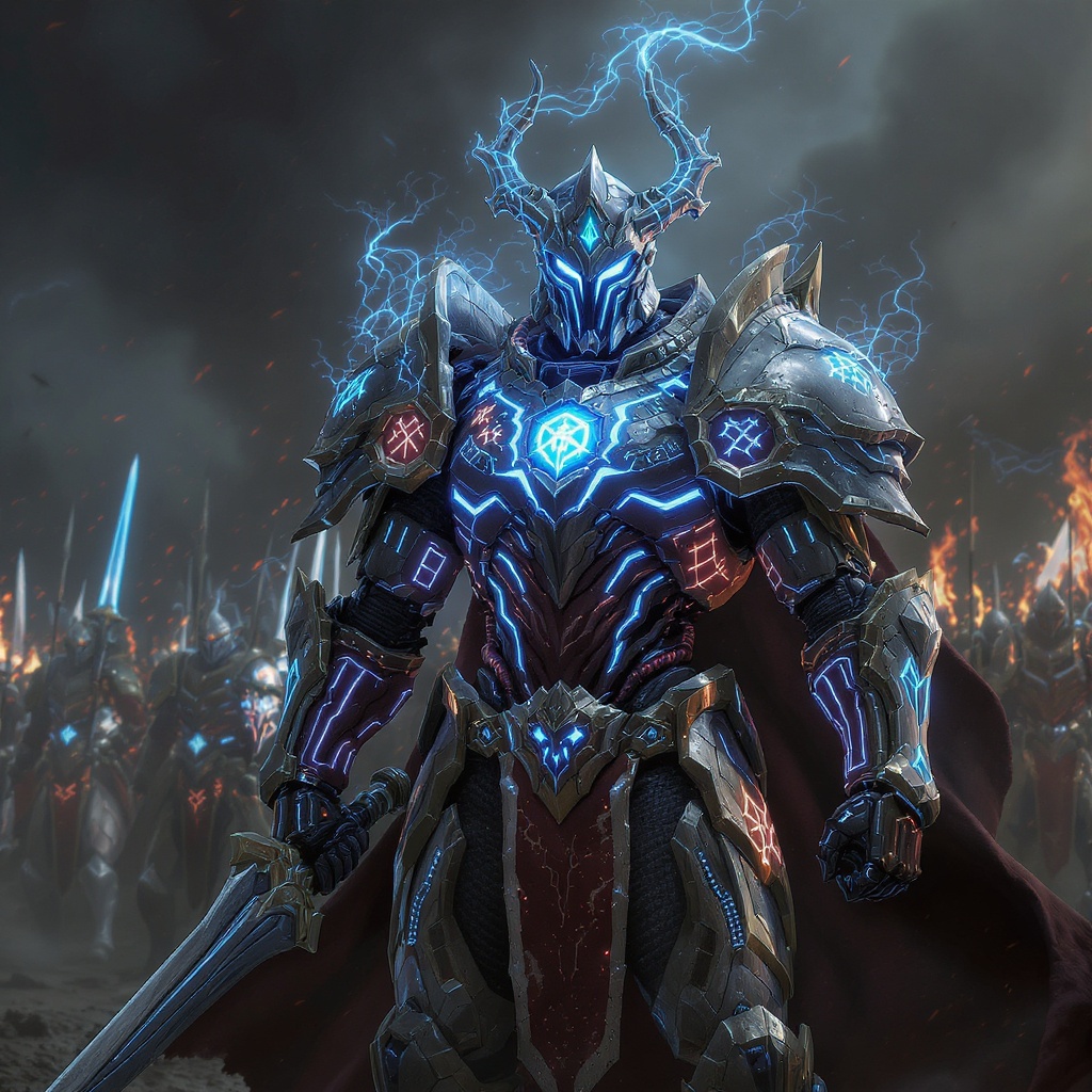 A striking masterpiece photoshoot capturing a full-body view of a futuristic necromancer soldier, clad in majestic royal armor laced with cutting-edge cybernetic enhancements, standing triumphantly at the forefront of the imperial army. The armor exudes a blend of holographic luminescence and gritty diesel aesthetics, with intricate details inspired by the art of Adam Fisher, suggesting a harmonious fusion of ancient mysticism and advanced technology. The necromancer's pose embodies victory and authority, commanding respect and awe, as shimmering holographic runes pulse across their armor, narrating tales of ancient powers intertwined with future warfare innovations. The scene is set against a backdrop that hints at a high-tech battlefield, where the soldier's presence is both commanding and otherworldly, leading their forces with an aura of invincibility and arcane prowess.