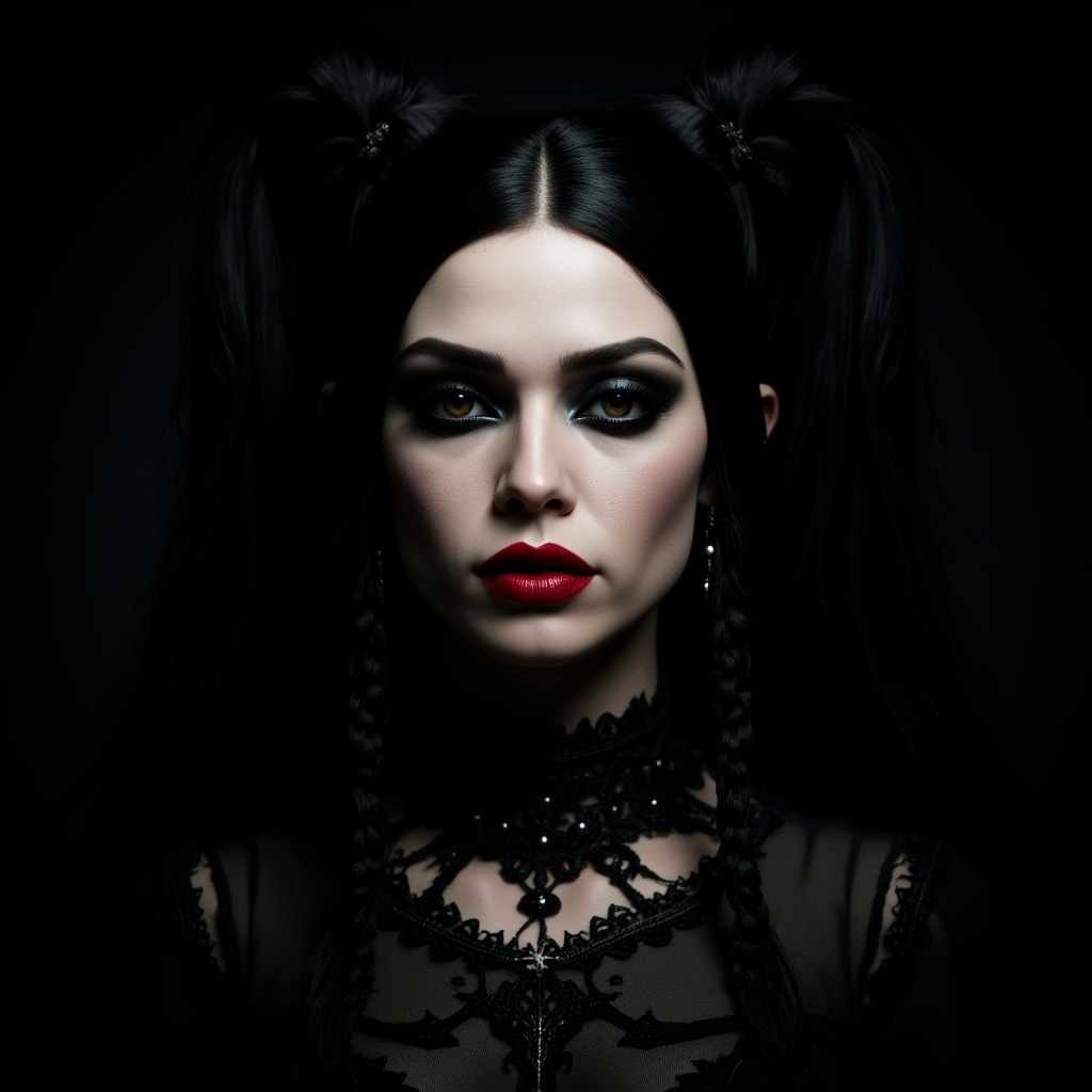 View this AI-generated image featuring masterpiece top notch quality single female deep shadows intricately detailed woman expressive eyes captivating gaze crimson lipstick no black eyeliner elaborate gothic attire ponytails dark hair captured with a nikon film camera hyper realistic lifelike textur