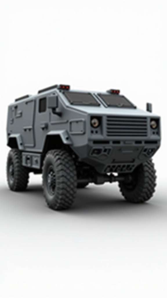 A hyper-realistic, matte charcoal armored personnel carrier with a boxy, angular design exudes an imposing presence. The vehicle features a heavy-duty front bumper integrated with circular LED headlights and a distinctive wide horizontal-slat grille. Its windshield and side windows are narrow, entirely black-tinted, and appear fortified for enhanced ballistic resistance. Elevated on colossal, rugged off-road tires adorned with aggressive deep treads, it's poised for unforgiving terrains. The side panels are sleek with an array of small, rectangular hatches or viewports dotted along the vehicle's length. Its design embodies a functional, military-industrial aesthetic, devoid of any visible markings or insignia, set against a stark, immaculate background that accentuates the vehicle’s angular structure and intricate details. Strategically placed lighting accentuates the texture of the armored plating, while shadows underneath amplify its elevated stance and clearance.