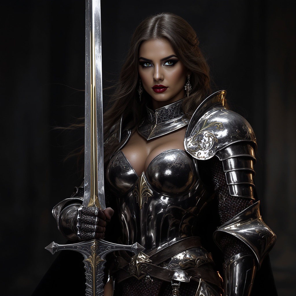 Medieval fantasy warrior woman, knight in ornate metal armor, seductive and confident, wielding a majestic sword, ultra-high-definition hyperrealism, cinematic lighting creating dramatic focus, intricate details captured in 8k resolution, depth of field emphasizing sharpness, photographed with a 50mm lens at f/1.4 for stunning clarity. Avoid low resolution, text errors, or any flaws like extra limbs, mutated features, or poor anatomy to ensure the portrayal is breathtakingly beautiful and masterfully detailed.