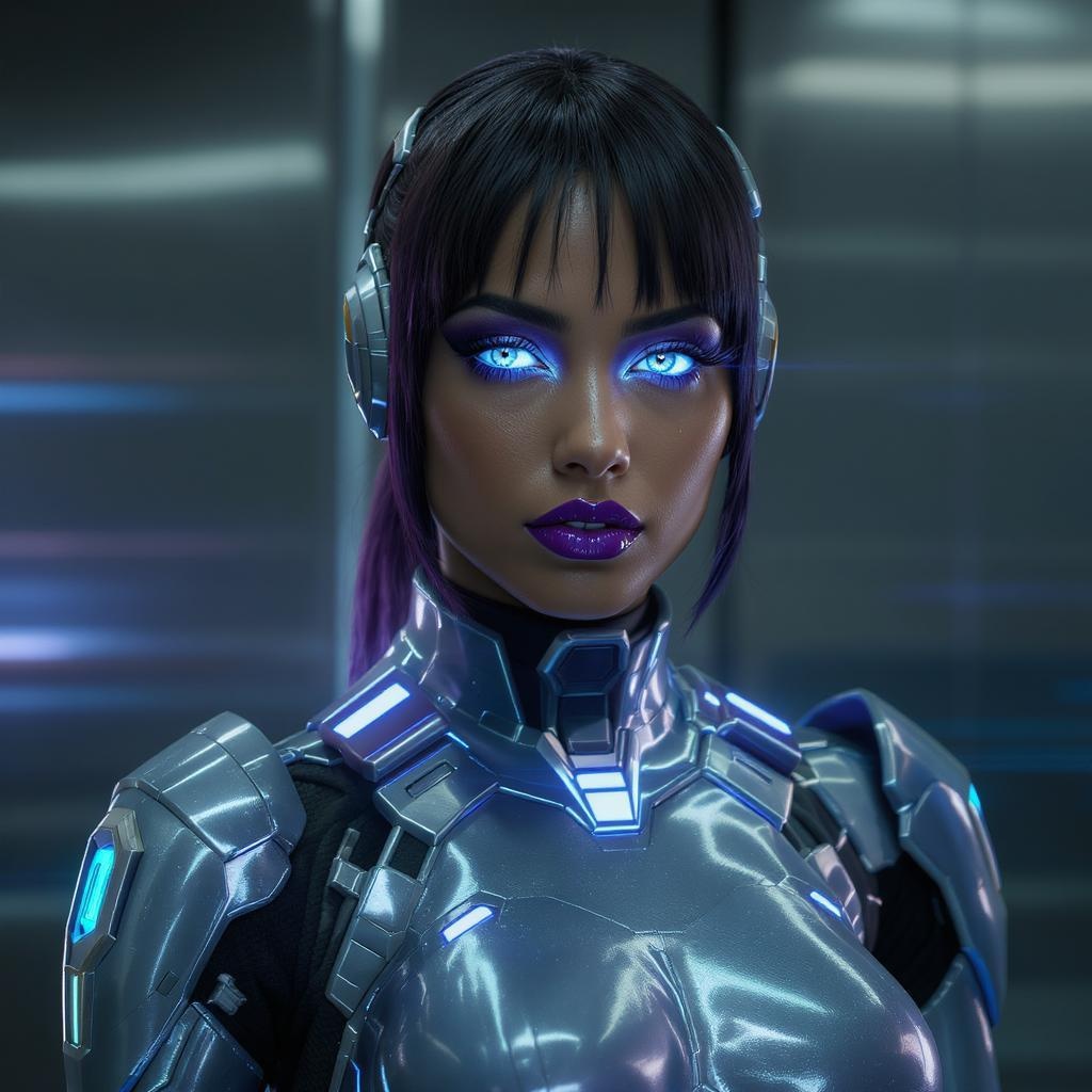 View this AI-generated image featuring medium shot portrait of a futuristic female soldier in a sleek space age latex suit with metallic accents showing intricate makeup with striking deep purple lips depicted in full growth within a cinematic setting utilizing film style lighting indicated as part