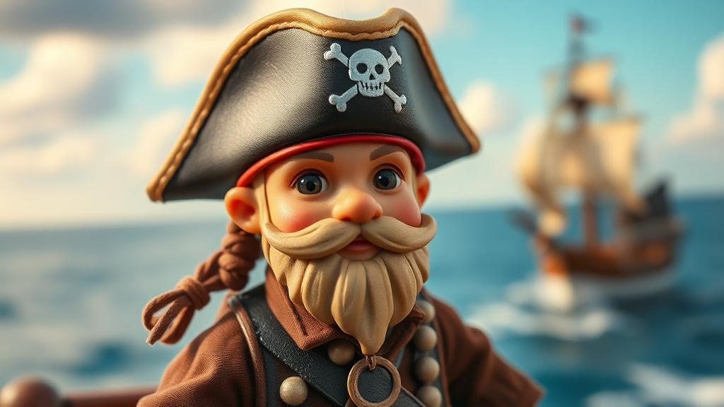 Miniature pirate adventurer with a whimsical flair, sporting a tricorn hat and a tiny beaded beard, adorned in playful pirate attire, set against the backdrop of a lively sea scene, capturing the spirit of seafaring mischief with cuteness and charm.