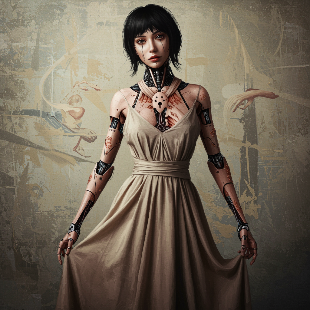 Mixed media creation featuring an emotional cyborg girl in an elegant, flowing dress, with skin lesions intricately woven as elements of her story. Crafted in the style of surrealist expressionism with a muted color palette, the artwork evokes a dreamlike atmosphere with abstract and distorted forms that challenge perception and invite introspection.