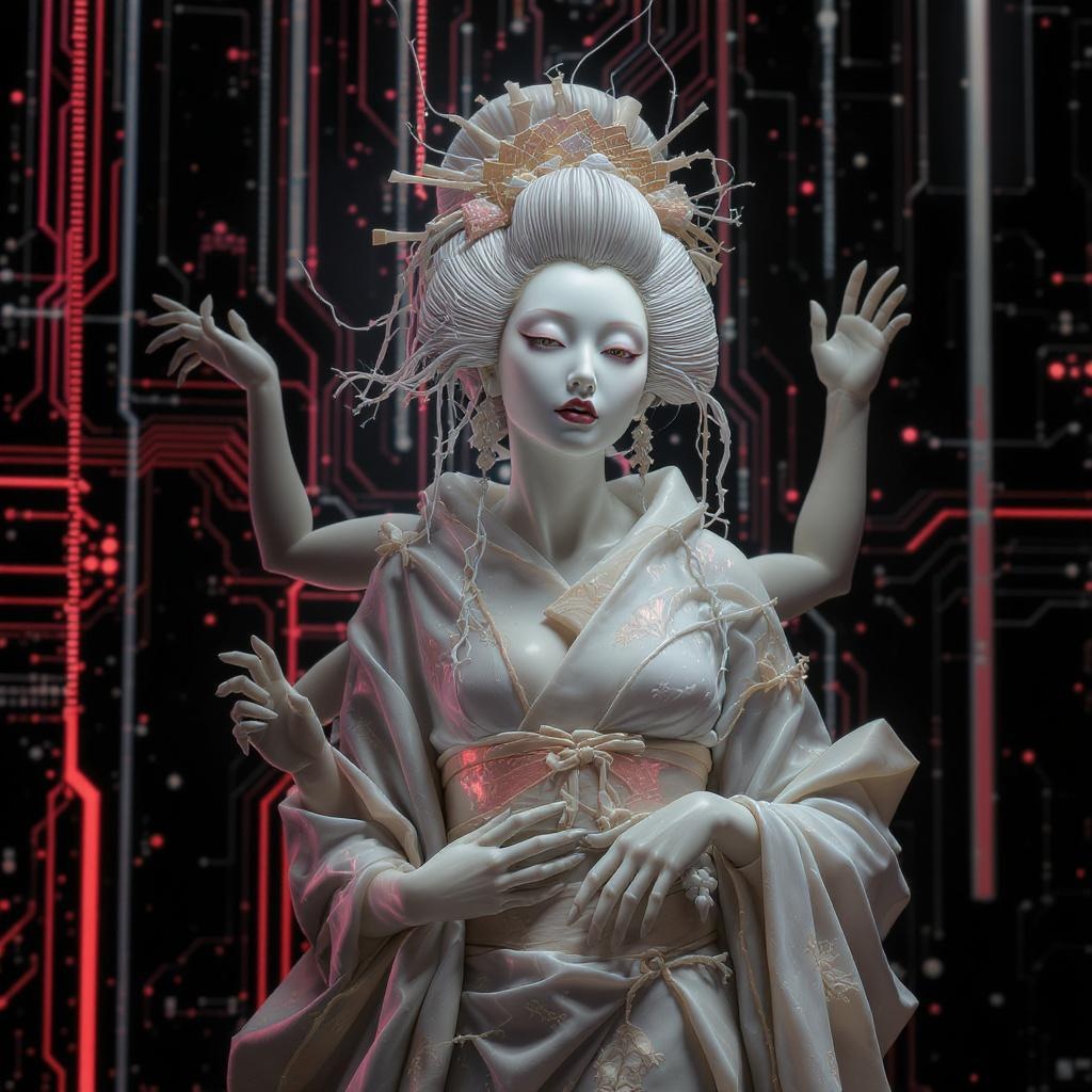 Mjrny style, exquisitely detailed marble and jade sculpture of a geisha, Hyperrealism, breathtaking, incredibly realistic, ultra detailed, cybernetic backdrop, cinematic lighting, intricately detailed, captivating photography, impressive setting, wide-angle, Portrait captured with a Hasselblad H3DII, meticulously detailed, DOF cgi, 3d, doll-like essence, octane, render, distorted anatomy, blurriness, fuzziness, multiple arms, extra fingers, distorted hands, disfigured, repeating patterns, deformed, mutated features, out of frame perspective, duplicated facial elements.