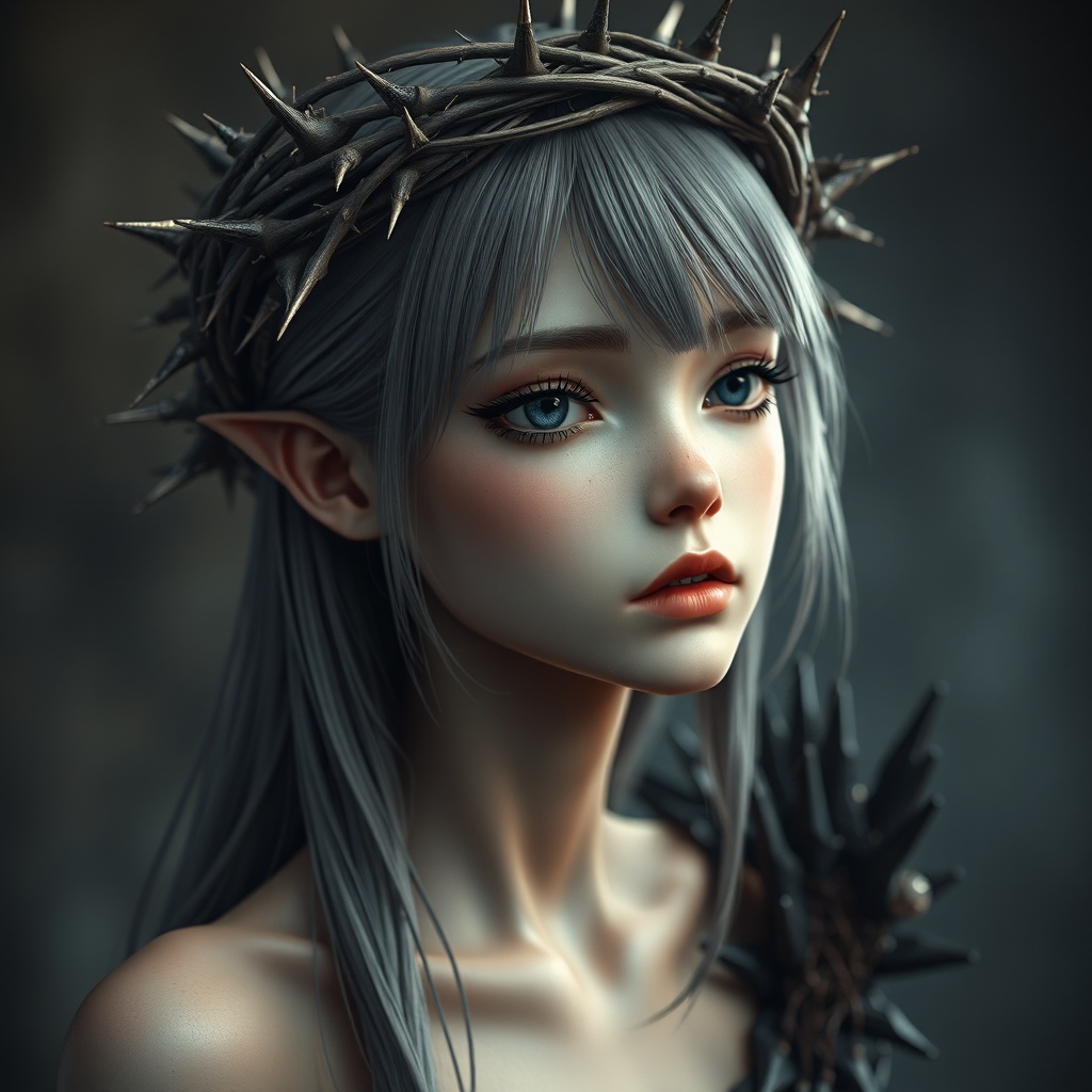 View this AI-generated image featuring 3d model of a stunning slender girl adorned with a crown of thorns intertwined with additional spikes rendered in a style combining hyper realistic detail with anime inspired aesthetics the scene captures a heistcore and dragoncore vibe showcasing realistic por