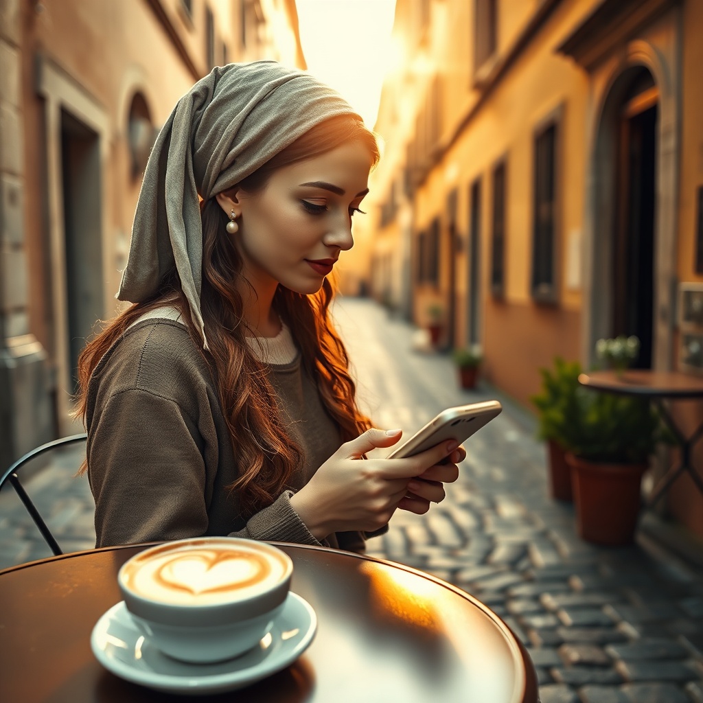 Modern digital photograph of a girl reminiscent of "Girl with a Pearl Earring" style, set in an Italian street scene. She sits at an outdoor café, her gaze fixed on her smartphone. A cappuccino with heart-shaped foam rests on the table beside her. The warm glow of the golden hour casts soft shadows over the rustic cobblestones, capturing a serene blend of Renaissance art and contemporary life.