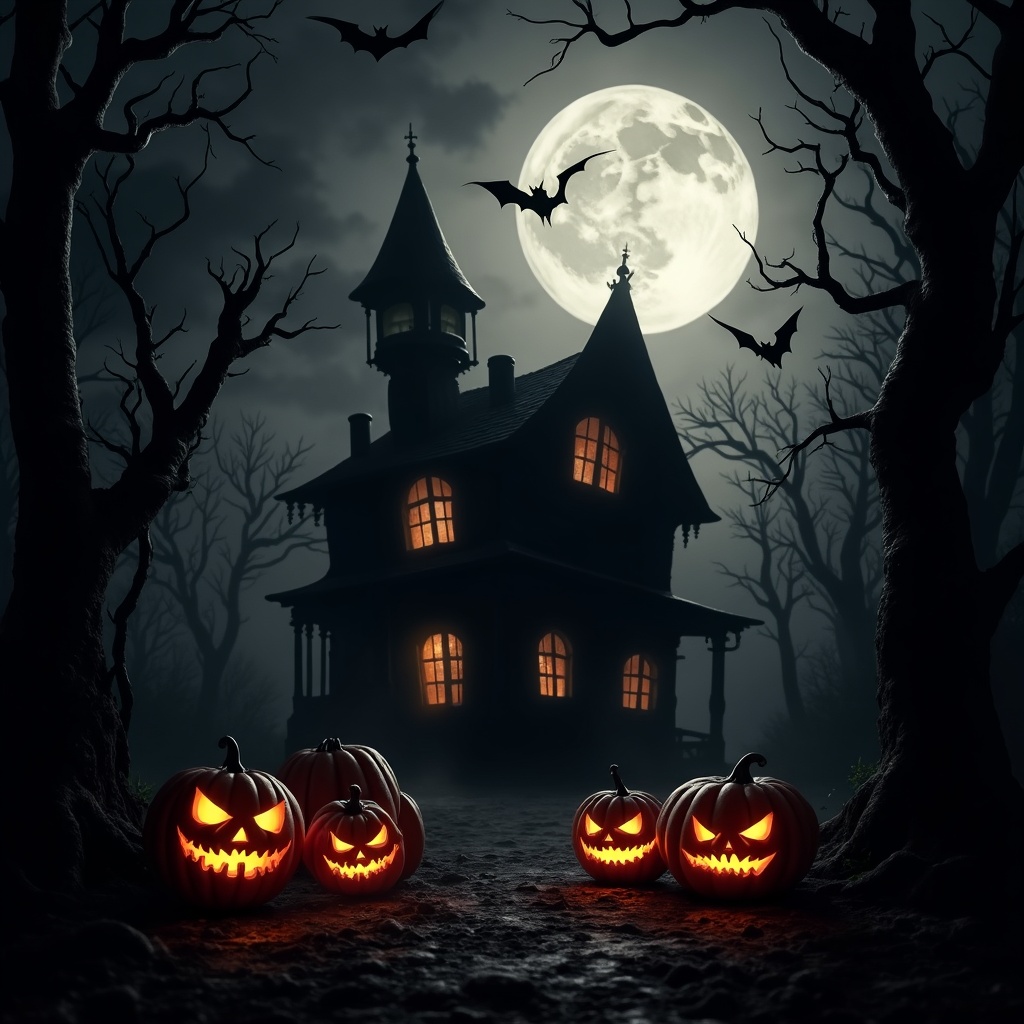 A chilling monochrome haunted house looms under a cloudy, stormy sky, surrounded by twisted, gnarled trees of a dark forest. Amidst the eerie shadows, vibrant glowing jack-o-lanterns flicker with menacing grins, casting a colorful, mysterious light. High above, bats swoop and circle around a large, luminous full moon that peeks through the swirling storm clouds, creating an atmosphere of supernatural tension and spine-tingling intrigue.