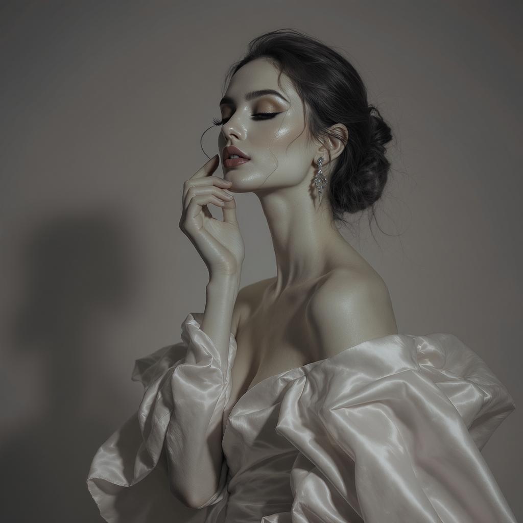 View this AI-generated image featuring mood tranquility ambiance calm fashion photoshoot influenced by mario testino female model depicted in entirety couture gown airy silhouettes intricate skin textures captivating eyes exceptional body structure ar 2 3 s 750. Created using advanced AI technology,