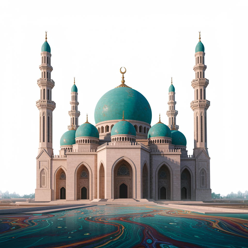 A stunning mosque, inspired by the painting styles of Lois van Baarle and Greg Rutkowski, with touches of Artgerm, featuring vibrant colors, fluid abstract forms, gentle lines, graceful curves, set against a pristine white background, captured in high resolution, blending surreal fantasy with geometric abstraction.