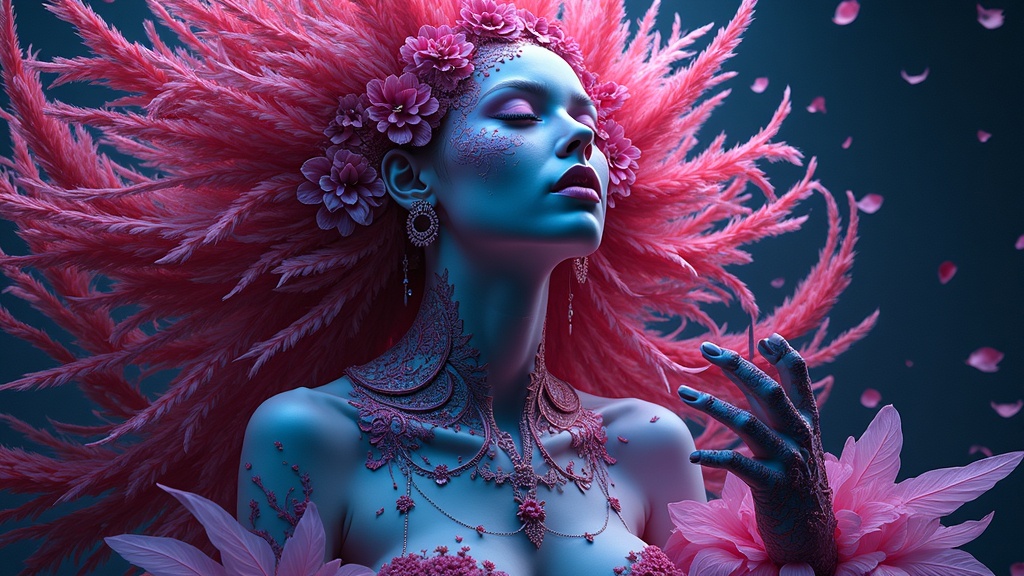 Neon-infused digital painting of a voluptuous concubine adorned with intricate feathers and flowers, inspired by the styles of Ernst Haeckel and Maria Sibylla Merian. This creation melds the artistic visions of luminaries like Tristan Eaton, Victo Ngai, Artgerm, Rhads, Ross Draws, Kaethe Butcher, Hajime Sorayama, Greg Tocchini, and Virgil Finlay. The scene is imbued with a sci-fi essence, featuring vibrant colors and striking neon lights reminiscent of an Ilya Kuvshinov illustration. Set in a high-definition 8k resolution, the piece plays with surreal elements like a cloned visage, elongated neck, and multiplicity of fingers, creating a world of mutation and transformation. This image is seamlessly crafted, avoiding distractions such as blurriness, watermarks, or any external text, focusing purely on the harmonious blend of organic motifs and futuristic aesthetics.