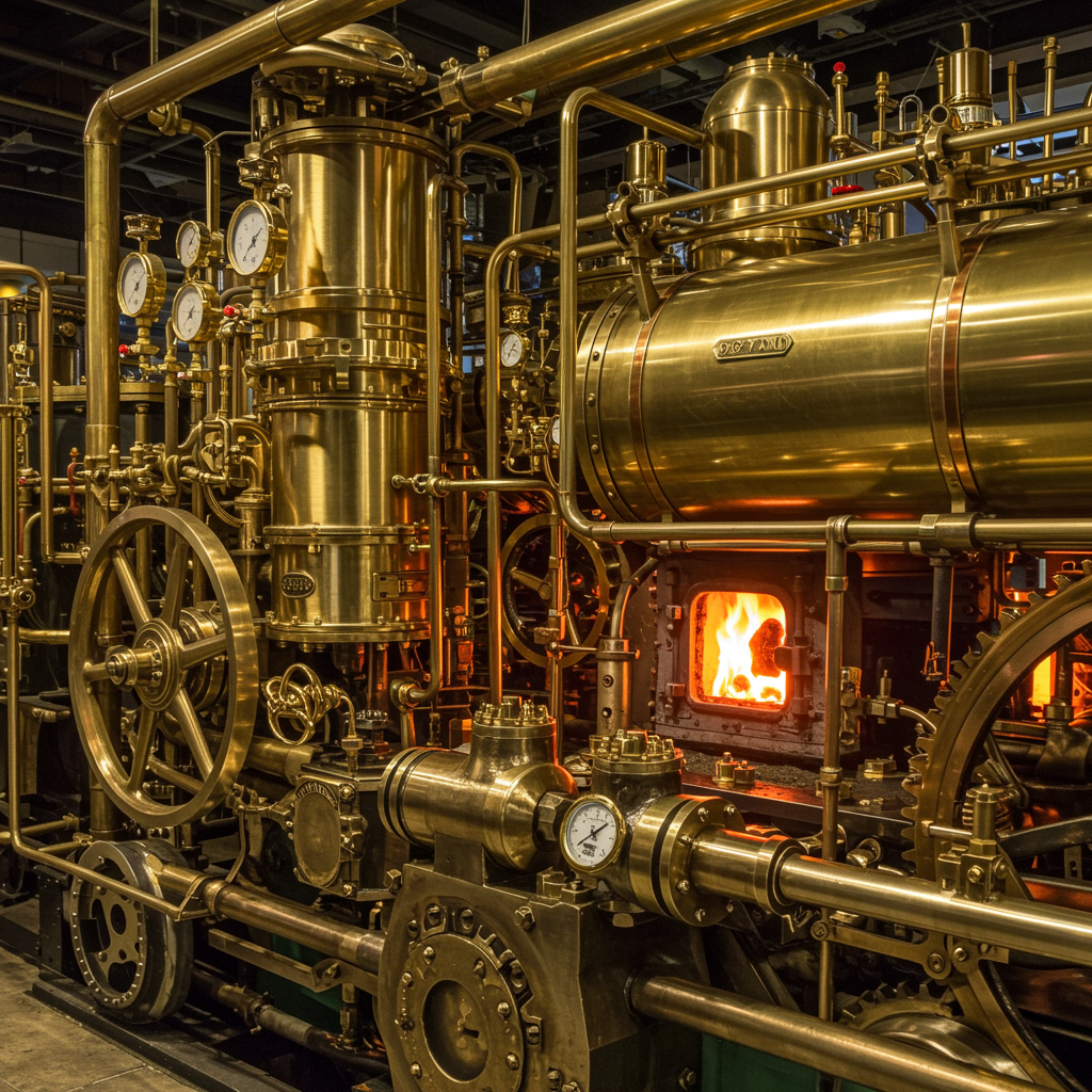 View this AI-generated image featuring in a labyrinthine network of polished brass and gleaming copper the majestic steam engine stands as a testament to the brilliant convergence of art and engineering its intricate gears mesh with precision weaving together a symphony of pistons that pulse rhythmi