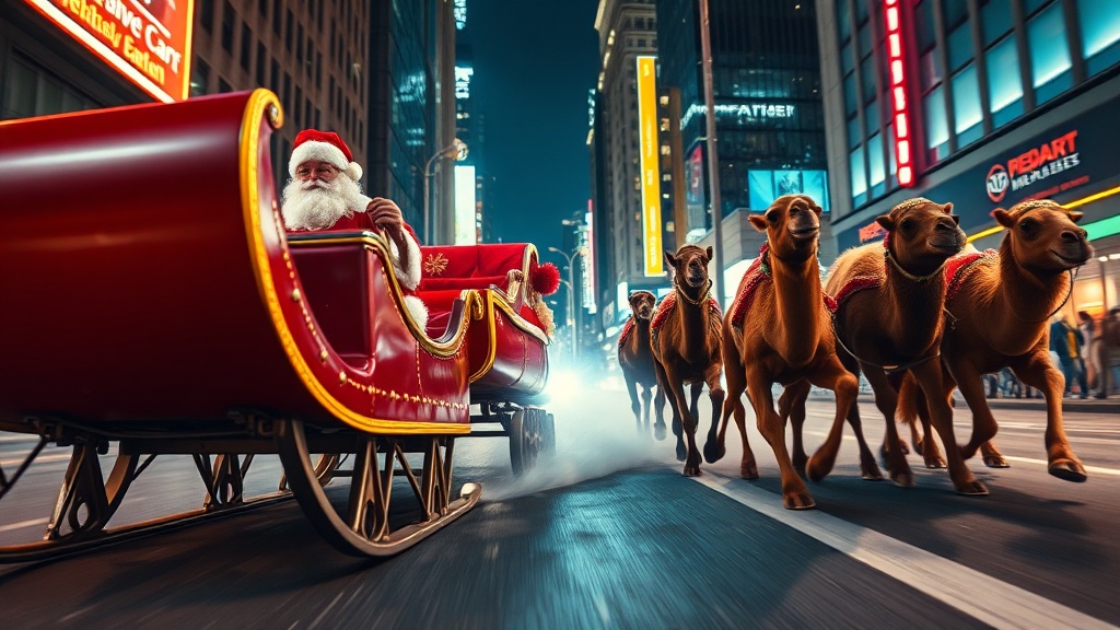 In a vibrant night-time cityscape, a thrilling race unfolds between Santa Claus and The 3 Wise Men. The video sequence opens with a close-up shot of Santa's sleigh's polished front, flanked by eager reindeer, their snorts visible in the chilly air. Beside them, the regal camels of The 3 Wise Men stamp the ground impatiently, their low grunts adding to the anticipation. Suddenly, the scene shifts to a wide shot as both the sleigh and camels surge forward. Santa's sleigh kicks off the race with a spectacular, magical burnout, while the camels gallop energetically, their hooves pounding on the bustling street. Neon lights glint off the sleek surfaces of the sleigh and the ornate decorations adorning the camels. The camera smoothly follows their rapid movement, capturing the thrilling acceleration and wild energy as they race through the urban landscape. The fast pace and seamless transitions between intimate close-ups and expansive wide shots enhance the excitement, showcasing the joyful competition against a dazzling city backdrop.