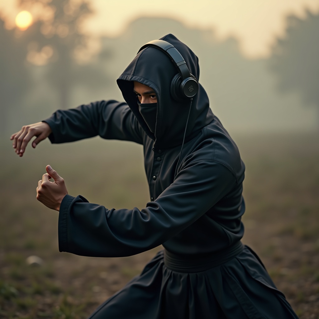 A male ninja clad in sleek, black full-body armor, the reflective surface subtly gleaming under the muted light of dawn. He stands poised in the stillness of a serene clearing, headphones enveloping his ears, playing the soothing strains of classical symphonies. With deliberate grace, he moves through the flowing sequences of Tai Chi, his movements a seamless blend of power and tranquility. The harmony of music guides his motion, as if each note and every stretch of his body are in perfect sync, creating a mesmerizing dance of calm amidst his formidable presence.