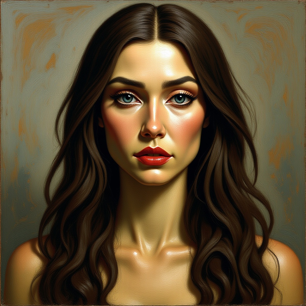 View this AI-generated image featuring oil painting of a fashion model with elegant long hair and perfect eyes portrayed with heavy brush strokes and rich textures inspired by artists like kaethe butcher greg tocchini hajime sorayama jeremy mann and carne griffiths this digital illustration captures