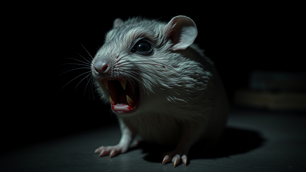 An eerie old hamster with matted fur and unsettling features stands out in the dim, shadowy setting, its small body casting elongated shadows. Its skin is hyper-realistic, revealing every wrinkle and fold, adding to its sinister appearance. The hamster's mouth gapes open, revealing unnaturally large, razor-sharp teeth, each stained with fresh, glistening blood. Its eyes are inky black voids, devoid of life and emotion, piercing the darkness with a haunting stare. A prominent scar slashes across its right cheek, hinting at a grim past. The creature is framed by a dark, foreboding background, enhancing the horror of its presence, as if it belongs to a world where nightmares are reality.