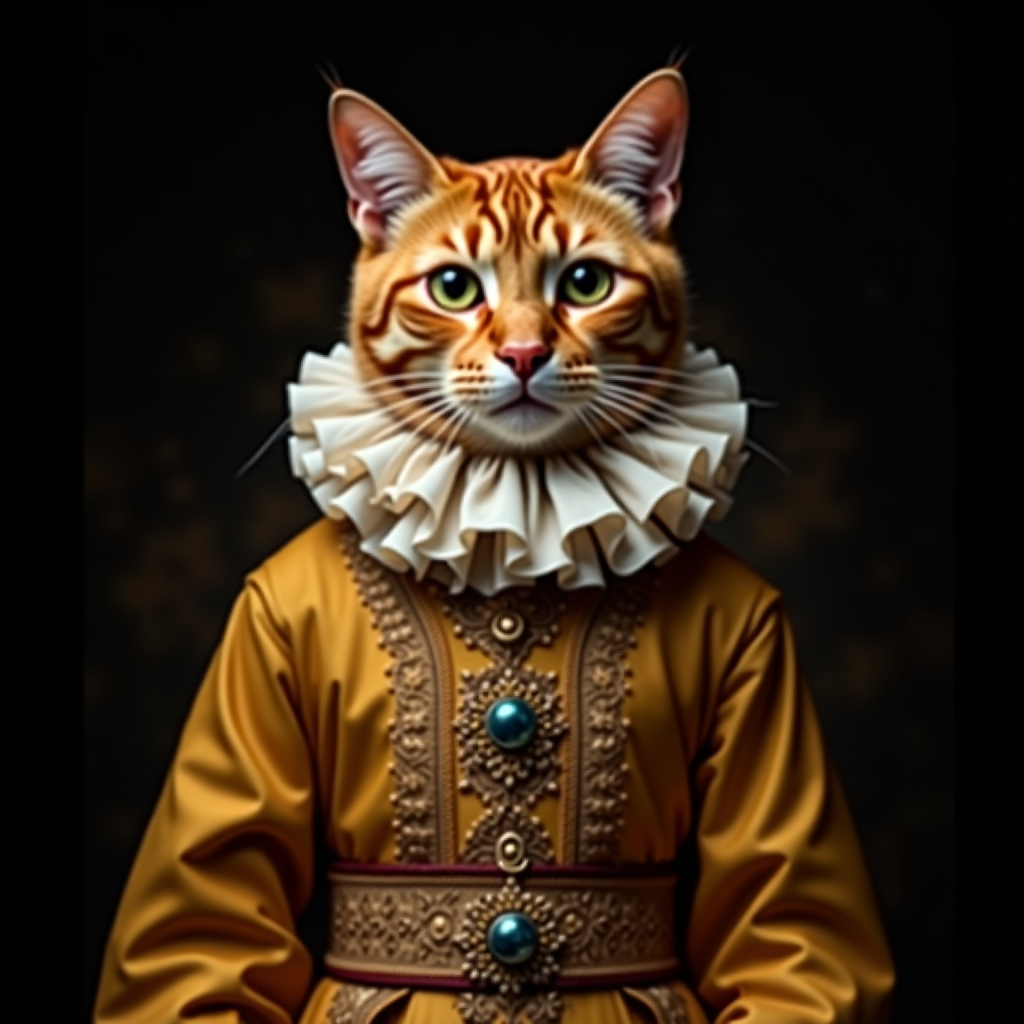 An elegant orange tabby cat poses regally in a renaissance-inspired studio portrait, adorned with an intricately embroidered golden robe and a sumptuous ruff collar. The feline exudes a noble demeanor, accentuated by ornate jewelry that glistens softly against a dark, atmospheric background. The composition captures the essence of historical fashion through its rich textures and sharp focus, highlighting the cat's dignified gaze and poised stature, akin to a noble of a bygone era.