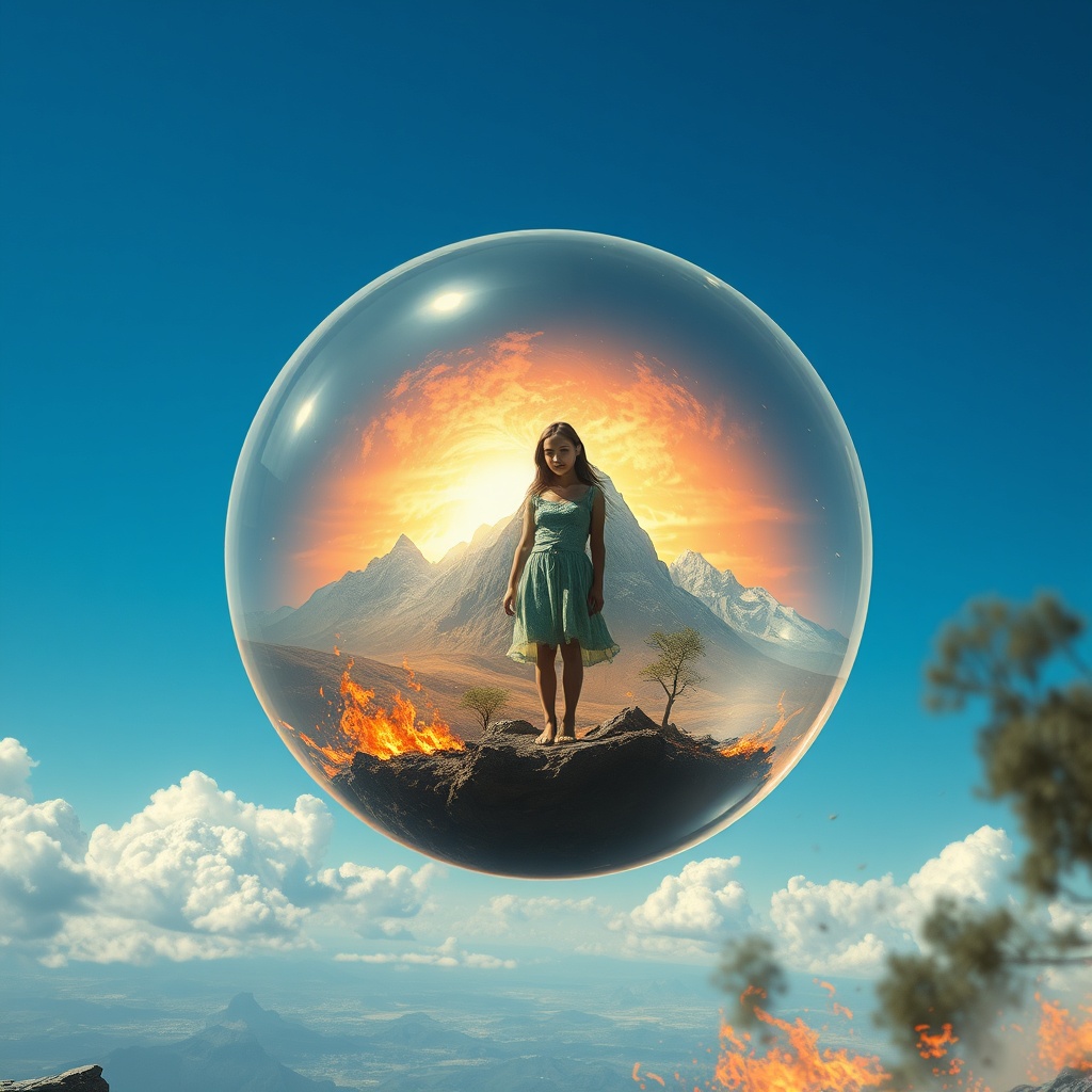 A crystalline orb floats in a pristine azure sky, encapsulating a meticulously detailed burning planet adorned with mountains and trees. In the background, a post-apocalyptic world is engulfed in flames. Ash and embers dance across the scene. Within the orb stands a 15-year-old girl of ethereal beauty, trapped yet serene amidst chaos.