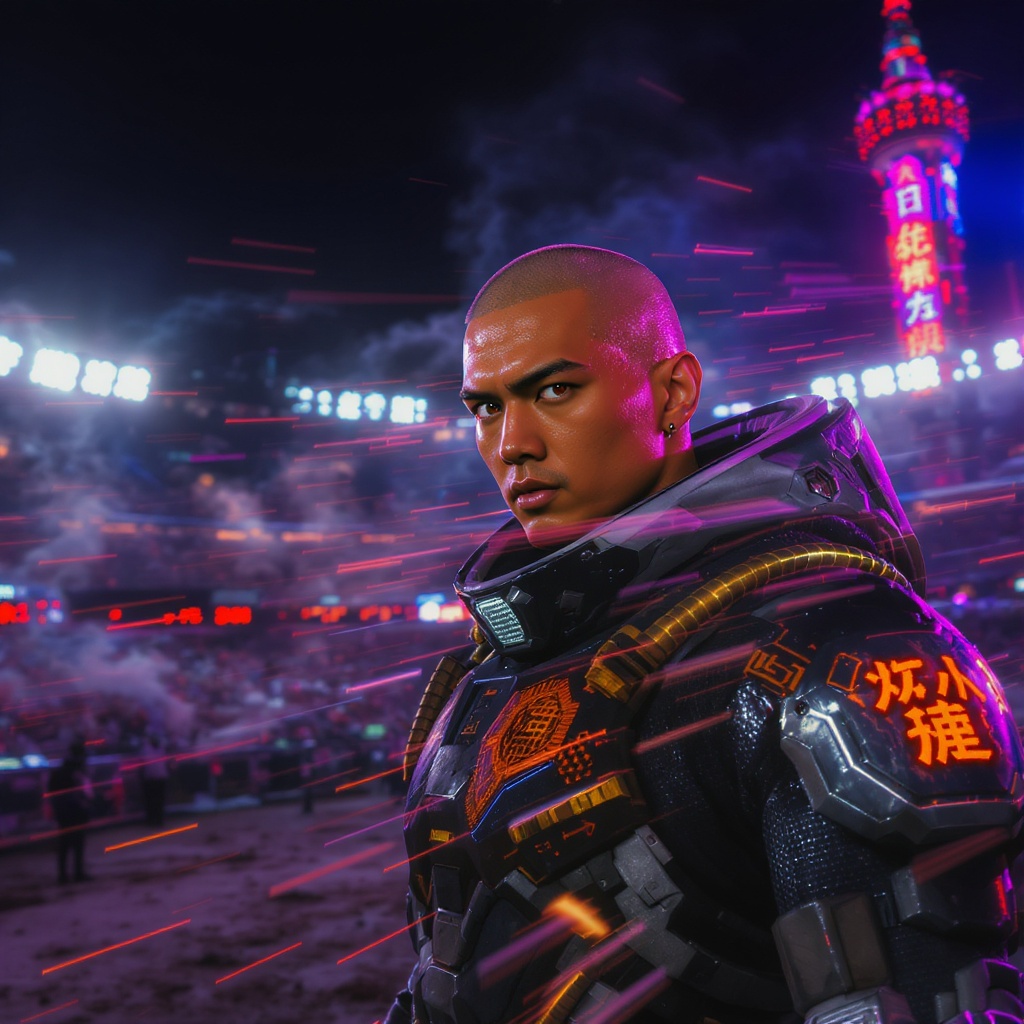 View this AI-generated image featuring outdoor arena wind sweeping through asian actor wu jing envisioned as a cyberpunk soldier futuristic armor gleaming shaved head reflecting the neon lights dynamic 9 16 aspect ratio landscape hints of a dystopian cityscape in the background atmosphere charged wi