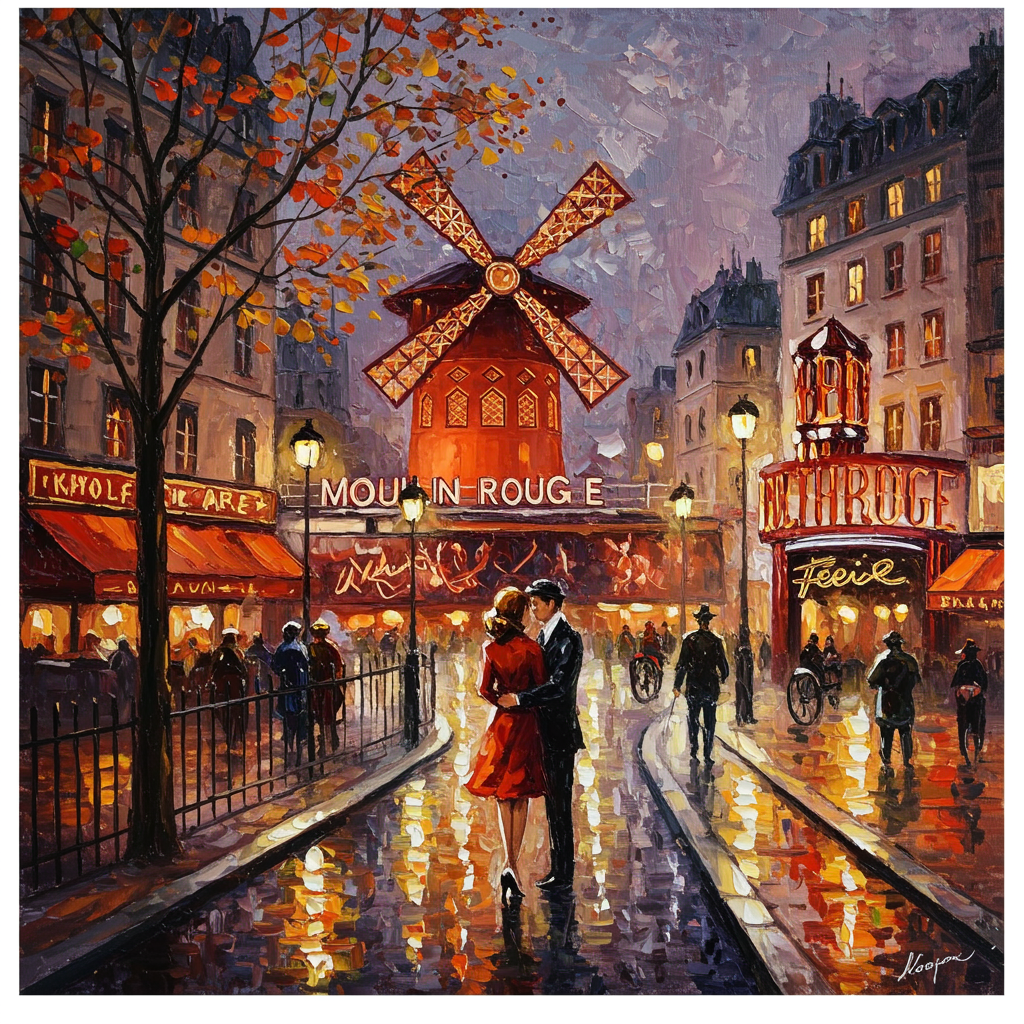 Paintings of Paris, rosy champagne hues, in the style of Mark League, watercolorist, showcasing a masterful composition with a textured, rustic feel. Set in the Autumn season during an early evening of the 1950s, capturing the romance of lovers near the enchanting lights of the Moulin Rouge.
