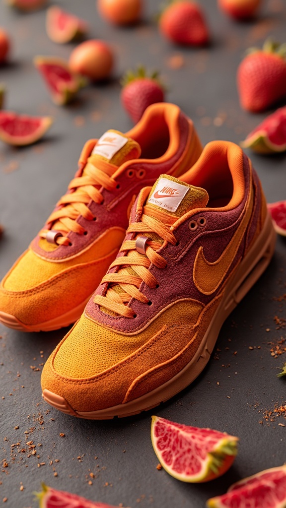 pair of sneakers crafted from vibrant dried fruit peels, rich in color, sleek design, stunning visual art, featuring the nike logo, a harmonious blend of innovation and nature
