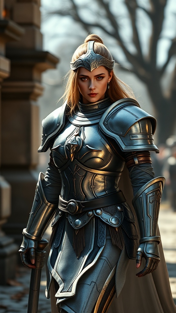 View this AI-generated image featuring a female paladin in full armor is captured in a graceful walking pose facing the camera as if shot in slow motion her detailed face and expressive eyes are highlighted exuding a sense of strength and purpose the scene is a masterpiece of high quality with preci